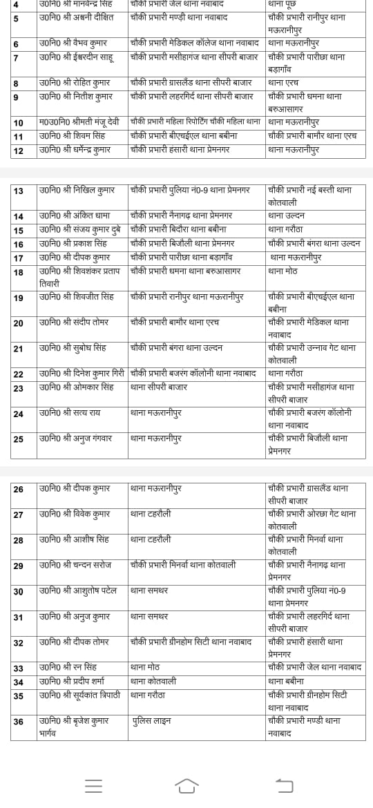 झांसी। आगामी लोकसभा चुनाव को दृष्टि गत रखते हुए निष्पक्ष शांतिपूर्ण कराने के लिए पुलिस ने अपनी कमर कस ली है। पुलिस विभाग में आज बड़े पैमाने पर तीन दर्जन उपनिरीक्षकों के कार्यक्षेत्र में फेर बदल कर दिया गया है।एसएसपी राजेश एस ने जनपद के तीन दर्जन दरोगाओं चौकी प्रभारियों के कार्यक्षेत्र में फेर बदल किया है। एसएसपी ने गुरुवार को कोतवाली थाना के नई बस्ती चौकी से उपनिरीक्षक आदेश कुमार को हटाकर मऊरानीपुर थाना, संदीप कुमार वर्मा को ओरछा गेट से हटाकर बबीना थाना की बेदौरा चौकी, रामसजीवन को उन्नाव गेट चौकी से हटाकर थाना तहरौली, मानवेंद्र सिंह को जेल चौकी से हटाकर थाना पूछ, अश्वनी दीक्षित को मंडी चौकी से हटाकर रानीपुर चौकी, वैभव कुमार को मेडिकल कॉलेज चौकी से हटाकर थाना मऊरानीपुर, इश्वरदीन साहू को मसीहा गंज चौकी से हटाकर परीक्षा चौकी प्रभारी, रोहित कुमार को ग्रास लैंड चौकी से हटाकर थाना एरच, महिला उपनिरीक्षक मंजू देवी को महिला रिपोर्टिंग चौकी से हटाकर मऊरानीपुर थाना, शिवम सिंह को भेल से हटाकर बामौर चौकी प्रभारी, धर्मेंद्र कुमार को हसारी से हटाकर मऊरानीपुर थाना, निखिल कुमार को पुलिया नंबर नौ से हटाकर नई बस्ती चौक प्रभारी, अंकित धामा को नैनागढ़ चौकी से हटाकर थाना उल्दन, संजय कुमार दुवे को चौकी बैदौरा से हटाकर गरौठा थाना, प्रकाश सिंह को बिजौली चौकी से हटाकर बंगरा चौकी प्रभारी, दीपक कुमार को परीक्षा चौकी से हटाकर थाना मऊरानीपुर, शिवशंकर प्रताप को धमना चौकी से हटाकर मोठ थाना, शिवजीत को रानीपुर से हटाकर भेल चौकी प्रभारी, संदीप तोमर को बामौर चौकी से हटाकर मेडिकल चौकी, सुबोध सिंह को बंगरा चौकी से हटाकर उन्नाव गेट चौकी, दिनेश कुमार गिरि को बजरंग चौकी से हटाकर थाना गरौठा, ओम प्रकाश को सीपरी से मसीहा गंज चौकी प्रभारी, सत्यराय को मऊरानीपुर से बजरंग चौकी, अनुज गंगवार को मऊरानीपुर से बिजौली चौकी प्रभारी, दीपक कुमार को मऊ रानीपुर से ग्रास लैड चौकी, विवेक कुमार को तेहरौली से हटाकर ओरछा गेट चौकी प्रभारी, आशीष सिंह को तेहरोली से हटाकर मिनर्वा चौकी प्रभारी, चंदन सरोज को मिनर्वा से हटाकर नैनागढ़ चौकी, आशुतोष पटेल को समथर से पुलिया नंबर नौ, अनुज कुमार को समथर से लहर गिर्द चौकी, दीपक तोमर को ग्रीन होम सिटी चौकी से हटाकर हसारी चौकी प्रभारी, रन सिंह को मोठ से जेल चौकी प्रभारी, प्रदीप शर्मा को कोतवाली से बबीना, सूर्यकांत त्रिपाठी को गरौठा से ग्रीन होम सिटी, बृजेश कुमार को पुलिस लाइन से मंडी चौकी प्रभारी बनाया।