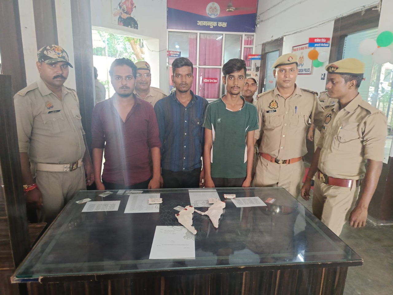 । कोतवाली थाना पुलिस ने तीन शातिरों को गिरफ्तार कर उनके कब्जे से लूट का ब्रेसलेट, दो तमंचे, तीन जिंदा कारतूस बरामद कर लिए। पुलिस के मुताबिक महोबा के खरेला निवासी अजीत कुमार ने 16 अगस्त को कोतवाली थाने में रिपोर्ट दर्ज कराते हुए बताया था कि बाइक सवार तीन युवकों ने उसे रोककर मारपीट कर उसके हाथ से ब्रेसलेट छीन कर ले गए। पुलिस ने मुकदमा दर्ज कर विवेचना शुरू कर दी थी। इधर मामले को गंभीरता से लेकर एसएसपी बीबीजीटीएस ने कोतवाली पुलिस को घटना का अनावरण करने के निर्देश दिए थे। एसएसपी के निर्देशन में आज थाना कोतवाली पुलिस ने अपराधियों की सुरागरसी में लगी कोतवाली पुलिस ने घटना को अंजाम देने वाले शातिर अपराधी नई बस्ती लाल स्कूल निवासी सोनू साहू, प्रशांत उर्फ कल्लू प्रजापति, विमल यादव को गिरफ्तार कर लूट का ब्रेसलेट ओर दो 315 बोर के तमंचे तीन जिंदा कारतूस बरामद कर लिए है।