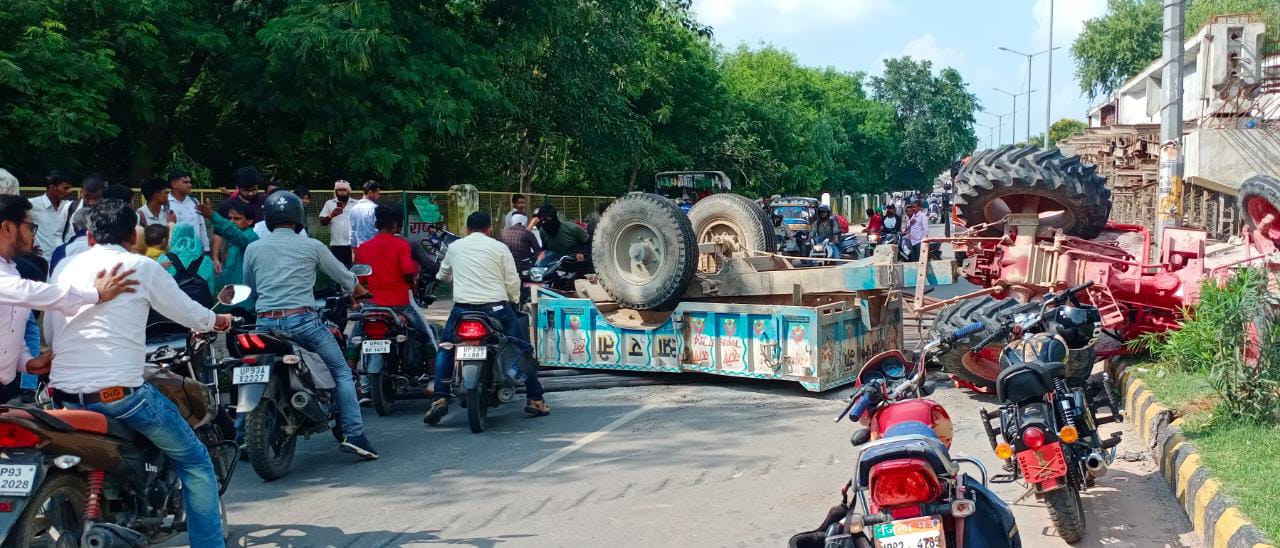 झांसी। ग्वालियर रोड ओवर ब्रिज निर्माण के दौरान आवा गमन में दिन रात जाम की स्थिति बनी रहती है। वाबजूद इसके वहां न तो कोई पुलिस सुरक्षा है और न ही कोई ट्रैफिक पुलिस कर्मी तैनात रहता है। लोगों को आने जाने के दौरान जाम से निकलने में काफी मशक्कत का सामना करना पड़ता है। लोहे के पाइप से भरा एक ट्रेक्टर अनियंत्रित होकर पलट गया जिससे वाहनों की लंबी कतार लग गई और जाम लग गया।जानकारी के मुताबिक सोमवार को दोपहर एक ट्रेक्टर ट्राली में लोहे के पाइप से भरा ग्वालियर रोड से बीकेडी की ओर आ रहा था। जैसे ही चालक रेलवे लाइन पार करके आगे बढ़ा तभी सामने से आ रहे वाहनों की भीड़ के चलते ट्रेक्टर ट्राली अनियंत्रित होकर पलट गई। जिससे उसमे भरे लोहे के पाइप सड़क पर फेल गए और चालक जमीन पर गिरकर गंभीर रूप से घायल हो गया। करीब आधा घंटे तक वहा दोनो ओर वाहनों का जाम लगा लगा और घायल जमीन पर पड़ा रहा। काफी देर बाद पुलिस मौके पर पहुंची ओर घायल को उपचार के लिए अस्पताल भिजवाया।
