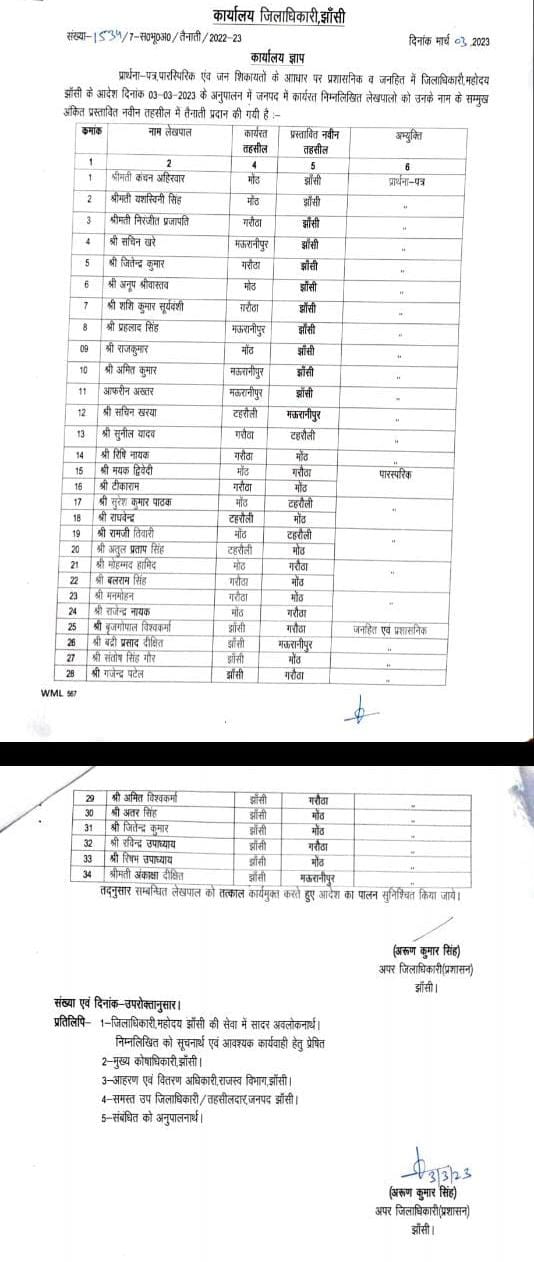 झांसी। जिलाधिकारी के निर्देशन पर दो दर्जन से अधिक लेखपालों के कार्यक्षेत्र में फेर बदल कर दिया है।शनिवार को जिलाधिकारी के निर्देशन पर अपर जिलाधिकारी अरुण कुमार सिंह ने जनपद के 34 लेखपालों के कार्यक्षेत्र में फेरबदल कर दिया। देखे सूची इस प्रकार है।