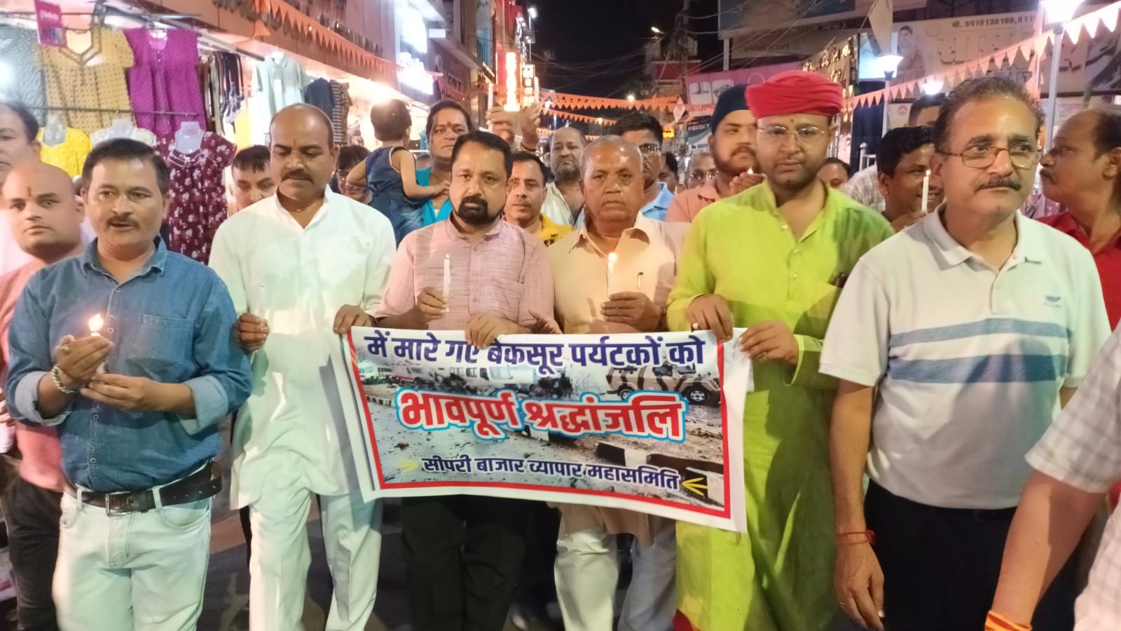 झांसी। आज उत्तर प्रदेश व्यापार मंडल महानगर शाखा एवं सीपरी बाजार व्यापार महासमिति के तत्वाधान में कश्मीर में हुए आतंकवादी हमले के विरोध में एवं मृतकों के श्रद्धांजलि देने के लिए एक कैंडल मार्च निकला गया उत्तर प्रदेश व्यापार मंडल के प्रदेश अध्यक्ष संजय पटवारी एवं में वर्तमान नगर अध्यक्ष पंकज शुक्ला के नेतृत्व में अत्रि चौराहे से प्रारंभ सुभाष मार्केट, सब्जी मंडी, रस बिहार से होता हुआ गुरु नानक चौक पर श्रद्धांजलि अर्पित की, इस अवसर पर वक्ताओं ने कहा कि आतंकवाद को समाप्त करने के लिए सरकार को कमर कसनी होगी और सरकार अपनी पूरी ताकत से उनका सामना करते हुए पाकिस्तान को सबक सिखाएं, इसके लिए संपूर्ण देशवासी सरकार के साथ है कैंडल मार्च में प्रमुख रूप सेगोकुल दुबे, श्याम भारद्वाज, दिलबाग सिंह भुसारी, अजय तिवारी, प्रदीप गुप्ता, सतीश जैन ,,प्रिंस भुसारी, सुरेश शर्मा, मनीष अग्रवाल, मुकेश सेठी, दीपक भाटिया, सोनू उपाध्याय, अभिषेक सिंह, राकेश खुल्लर, अशोक गुरबख्शानी, सनी शिवहरे, आशु मित्तल, रविद्र कुमार धीर, अजीत सेठी, कमल मल्होत्रा, मोहन सिंह भुसारी, रिंकू अरोरा, पवन शर्मा, दीपक बसेड़िया, राहुल सेन, अरविंद राय, सौरभ दुबे, सुरेश केवट, नीरज वर्मा, बादशाह खांन, नीरज वर्मा अंत में सीपरी बाजार व्यापार महासमिति के अध्यक्ष अजय चड्ढा ने सभी का हमारे व्यक्त किया।
