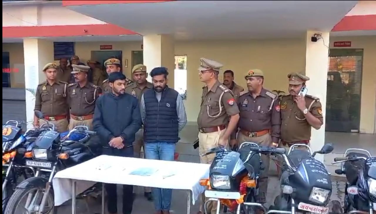 झांसी। वाहन चोरों के खिलाफ चलाए जा रहे अभियान के तहत स्वाट टीम, नवाबाद थाना पुलिस ने दो शातिर बदमाशों को दबोच कर उनके कब्जे से 11 चोरी की बाइक, फर्जी दस्तावेज और तमंचा कारतूस बरामद कर लिए।रविवार को पुलिस लाइन सभागार में आयोजित पत्रकार वार्ता के दौरान एसपी सिटी ज्ञानेंद्र ने जानकारी देते हुए बताया की एसएसपी राजेश एस के निर्देशन में वाहन चोरों के खिलाफ चलाए जा रहे अभियान के तहत नवाबाद थाना पुलिस ने मुखबिर की सूचना पर भगवंत पुरा जाने वाले मार्ग स्थित खाली प्लाट पर छापा मारकर ग्यारह चोरी की बाइक और फर्जी दस्तावेज बरामद करते हुए कोतवाली थाना क्षेत्र के बड़ागांव गेट बाहर निवासी अनिकेत यादव तथा उसके साथी मिशन कंपाउंड निवासी बॉबी यादव को गिरफ्तार कर लिया। एसपी सिटी ने जानकारी देते हुए बताया की पकड़े गए दोनो शातिर बदमाश बाइक चोरी कर फर्जी एप के माध्यम से फर्जी दस्तावेज तैयार कर बाइक बेच देते थे।