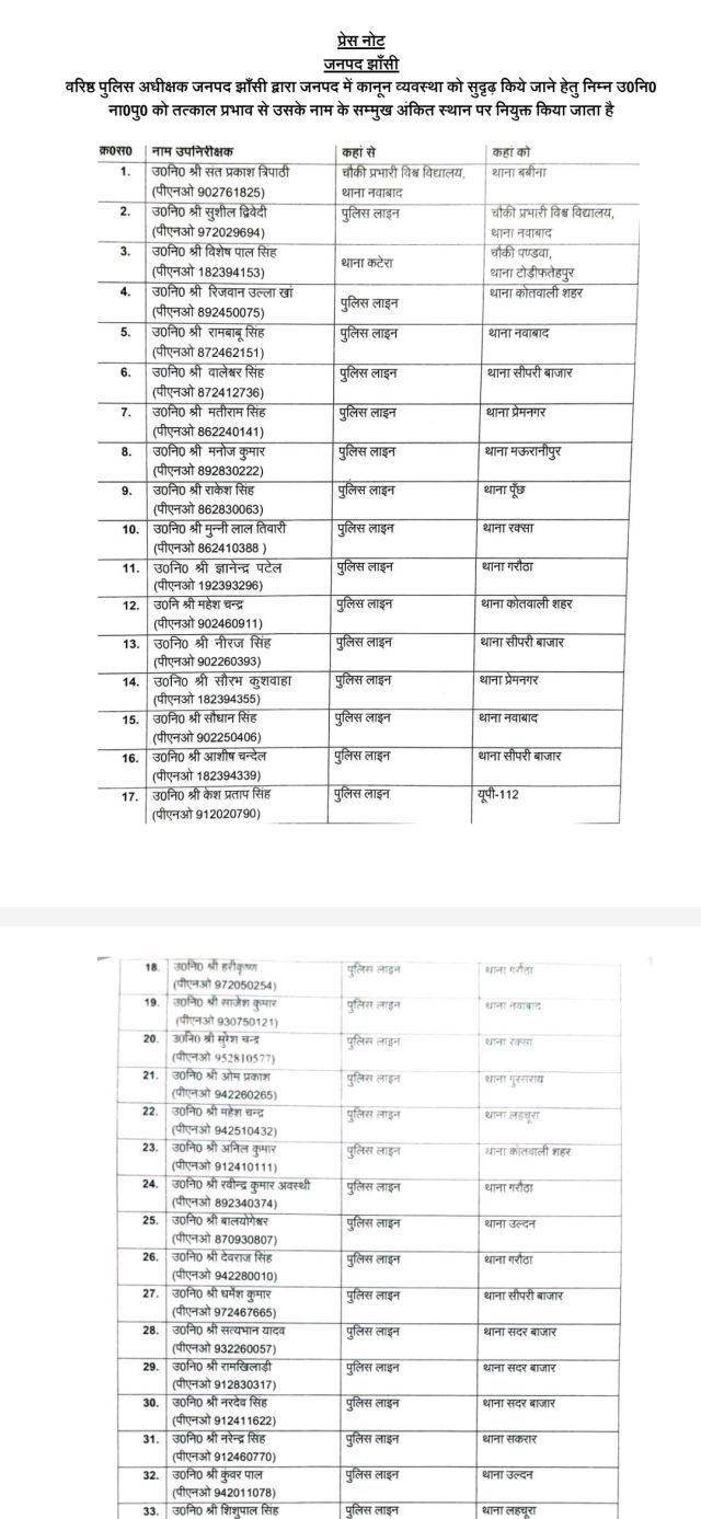 झांसी। एसएसपी बीबीजीटीएस ने देर रात कानून व्यवस्था को चुस्त दुरुस्त रखने के लिए विश्विद्यालय ओर पण्डवा चौकी प्रभारियों को बदलते हुए पुलिस लाइन में तैनात 84 दरोगाओं को जनपद के थानों में नई तैनाती दी है। सूची में देखे किस दरोगा को किस थाने में मिली तैनाती।