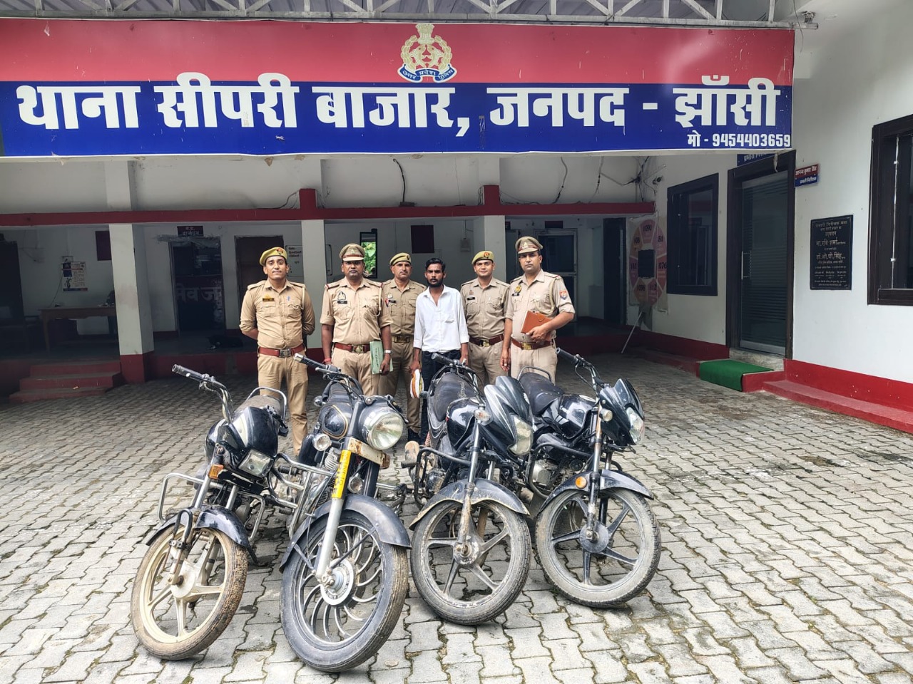 झांसी। एसएसपी बीबीजीटीएस मूर्ति के निर्देशन में वाहन चोरी की रोकथाम और वाहन चोरों के खिलाफ चलाए जा रहे अभियान के तहत सीपरी बाजार पुलिस ने शातिर वाहन चोर को दबोच कर उसके कब्जे से चोरी की चार बाइक बरामद कर ली है। जानकारी के मुताबिक सीपरी बाजार थाना पुलिस ने देर रात गस्त के दौरान मुखबिर की सूचना पर अजय रायकवार निवासी सूती मिल पावर हाउस के पास ग्वालियर रोड निवासी को गिरफ्तार कर लिया। पुलिस ने उसके कब्जे से चोरी की चार बाइक क्रमांक यूपी 93 br 88342, यूपी 93 ah 2515, up 93 am 7660, सहित एक बिना नंबर की बाइक बरामद की है। पीस ने आरोपी को जेल भेज दिया है।