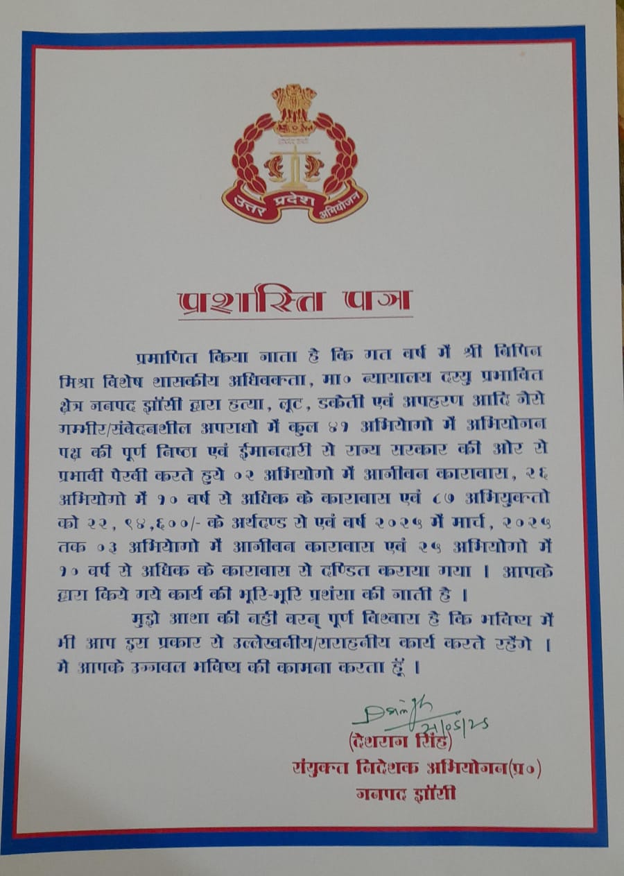 झांसी। ईमानदार छवि और कार्य के प्रति निष्ठावान शासकीय अधिवक्ता विपिन कुमार मिश्रा पूर्व में जिलाधिकारी ओर एसएसपी द्वारा सम्मानित हो चुके है। इनकी ईमानदार छवि और अपराधियों को अधिक सजा दिलाए जाने पर इन्हें एक बार फिर सम्मानित किया गया है। राज्य सरकार की ओर से प्रभावी पैरवी करने ओर अभियुक्तों को पूर्णनिष्ठा ओर ईमानदारी से अधिक से अधिक सजा दिलाने पर विशेष शासकीय अधिवक्ता विपिन कुमार मिश्रा को अभियोजन निदेशक ने प्रशस्ति पत्र देकर सम्मानित करते हुए उनकी भूरी भूरी प्रशंसा की। बुधवार को संयुक्त निदेशक अभियोजन झांसी देशराज सिंह द्वारा विशेष न्यायालय दस्यु प्रभावित क्षेत्र जनपद झांसी में लुट, हत्या, डकैती, अपहरण, आदि के मुकदमों में विशेष शासकीय अधिवक्ता विपिन कुमार मिश्रा द्वारा अभियोजन में पूरी ईमानदारी निष्ठावान से पैरवी कर आरोपियों को अधिक से अधिक सजा दिलाए जाने पर उन्हें प्रशस्ति पत्र देकर सम्मानित किया ओर उनकी ईमानदारी की भूरी भूरी प्रशंसा की। आपको बता दे कि पूर्व में विशेष शासकीय अधिवक्ता विपिन कुमार मिश्रा को ईमानदार छवि के चलते एसएसपी ओर जिलाधिकारी द्वारा भी सम्मानित किया जा चुका है।