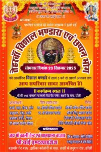 । नवरात्रि उत्सव पर सिद्ध पीठ महाकाली मंदिर पर तेरहवां विशाल भंडारा का आयोजन 29 सितंबर को होगा। जय मां काली टेंट शामियाना हाउस एवं श्री साईं इंटर प्रायजेज के तत्वावधान में हर वर्ष की तरह इस वर्ष भी नवरात्रि उत्सव पर लक्ष्मी गेट बाहर स्थित सिद्ध पीठ मां काली मंदिर पर 29 सितंबर को विशाल भंडारे का आयोजन किया जा रहा है। आयोजकों ने मां के सभी भक्तजनों से अपील की है कि अधिक से अधिक भक्तजन उपस्थित होकर भंडारा प्रसाद ग्रहण करे।